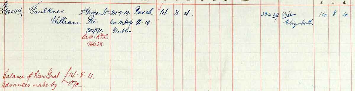 1919 Sep 24. Died at died of pneumonia at Central Military Hospital Dublin. Husband of Elizabeth Faulkner, of 6, Charles St., Aberdeen.