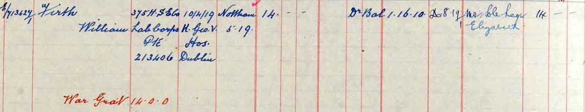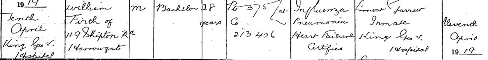1919 Apr 10. Died at K Geo V Hospital Dublin. Son of Benjamin and Elizabeth Firth, of 119, Shipstone Rd., Harrogate.
