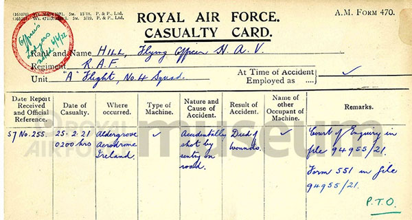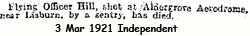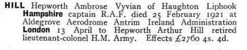 1921 Feb 25. Shot accidently by a sentry, age 24, Son of Lt.-Col. H. A. Hill (West India Regt.) and Mrs. Hill, of "Haughton," Liphook, Hants.