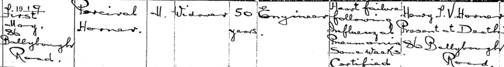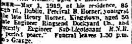 1919 May 1., serving on HM Tug ‘Cynic’ (auxiliary small craft) died of heart failure following influenza and pneumonia, aged 50 at 86 Ballybough Road, Dublin