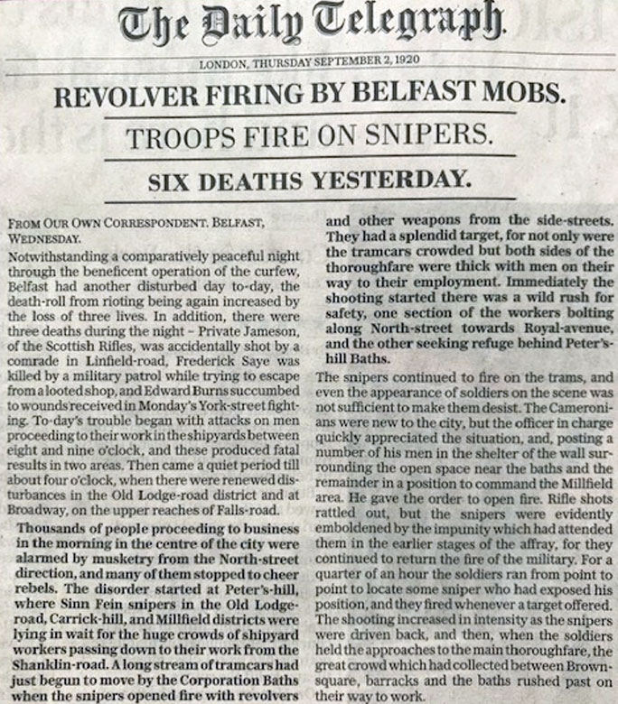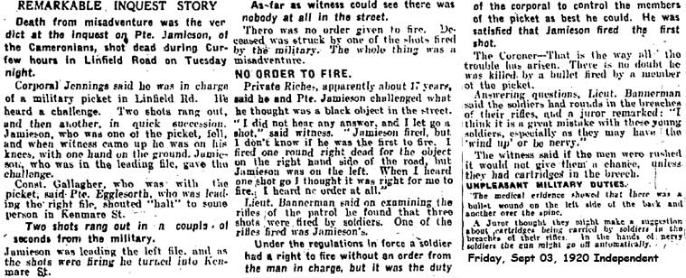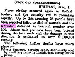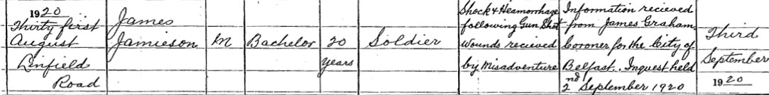 1920 Aug 31. Accidently shot by Military patrol in Linfield, Belfast