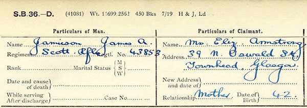1901 Born Barrow-in-Furness. His Mother was Elizabeth Jamieson (later Elizabeth Armstrong after she married John Armstrong between 1914 and 1920) . His Father was Robert Jamieson a Ship Yard Foreman born in 1873, he died 3 May 1914 aged 41 at Ruckhill Hospital Glasgow. His obit in the paper says he was the second son of Robert Jamieson from Stoneymeadow, High Blandtyre and husband of Elizabeth Jamieson of Townhead, Glasgow