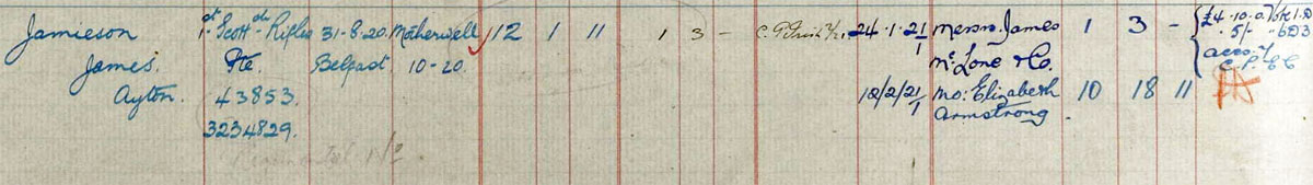 Served in Belfast as 3234829 Private James Ayton Jamieson, 1st Battalion, Cameronians (Scottish Rifles)