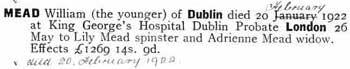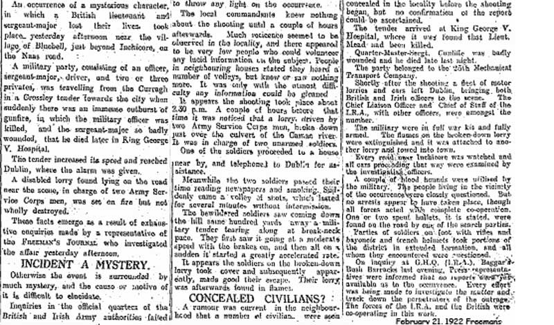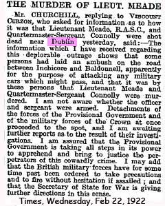 1922 Feb 20. They appear to have come across a group of men who had stolen a military lorry, and were burning the lorry. The men opened fire on Lt Meade's lorry which contained Lt Meade, CQMS Cunliffe and 2 Privates. Meade and Cuncliffe were either killed or mortally wounded. The privates returned fire the lorry had turned a corner and they were out of sight. Irish Gro gives "Meade" and probate has "Mead"
