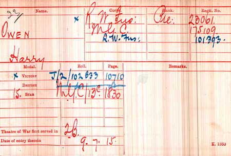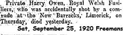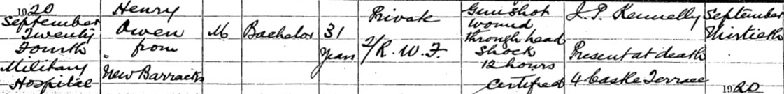 1920 Sep 24. RWF enlistment book of post 1920 renumbering at RWF Archives records that he died at Limerick Military Hospital of 'GSW accidentally received' . It also contains info that identifies him as Harry Owen RWF 23601/MGC 175109/RWF101393 in Medal Cards.. He was shot by another soldier in Limerick Barracks