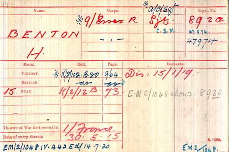 1915 May 30. Acting Colour Sgt H Benton entered the war in France. It is difficult with the given facts but this appears to be probably him with a service record from 1907, which would explain why he was a Sgt in 1915