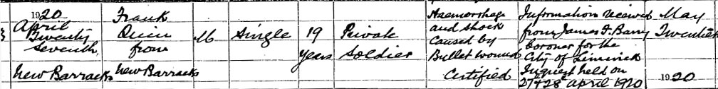 1920 Apr 26. He was shot in the head by person unknown with a revolver at about 22.30 at the Cattle Yard of O’Connell Avenue Limerick.