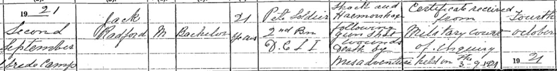 There was a surge of British reinforcements to Ireland in the summer of 1921.This regiment arrived in Dublin on 4th July 1921 just a week before the Truce.There is a Jack Radford b1900, d Naas Oct/Dec 1921 who appears to be the only man on Irish GRO to be a candidate