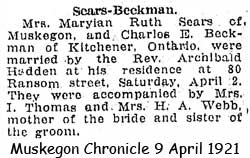 1921 Apr 2 Marries in Kitchener, Ontario, Canada, to Marylan Ruth Scars (Ruth Elizabeth Hedrick?)