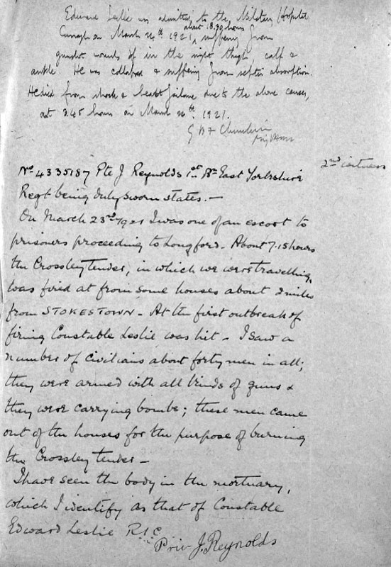 1921 Mar 23. Shot in Strokestown Ambush and died 26 Mar in hospital
