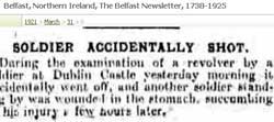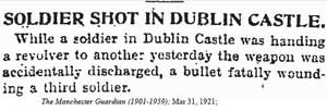 There is a report in a provincial English paper as well, saying a Private was accidently shot in the stomach by a revolver. So it appears that a soldier did die in Dublin on 30 Mar 1921 as a result of this accident