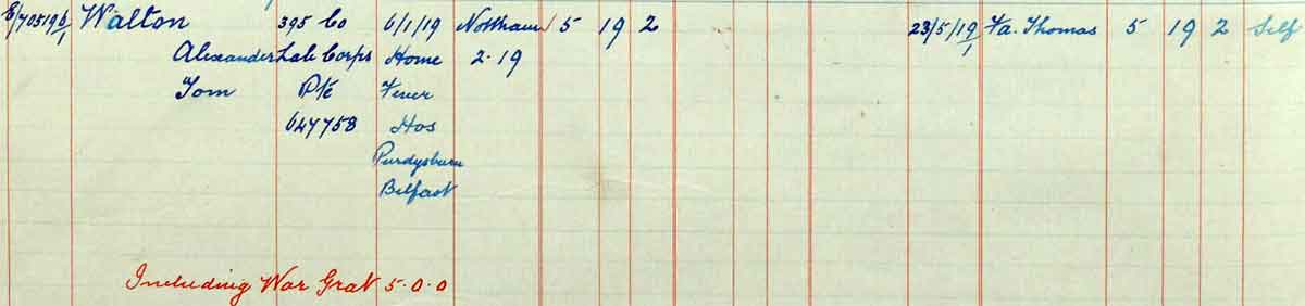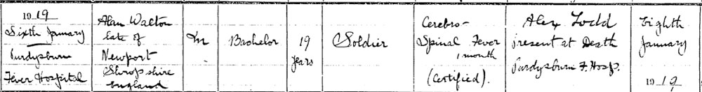 1919 Jan 6. Died at Home Fever Hos Purdysburn Belfast . Son of Thomas and Emma Walton, of 24, Tibberton, Wellington, Salop.