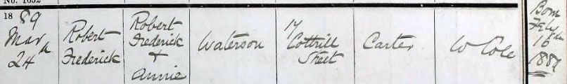 1889 Feb 16. Born at 17 Cottrill St, Salford, Manchester. Son of Robert Frederick and Annie (nee Peart) Waterson